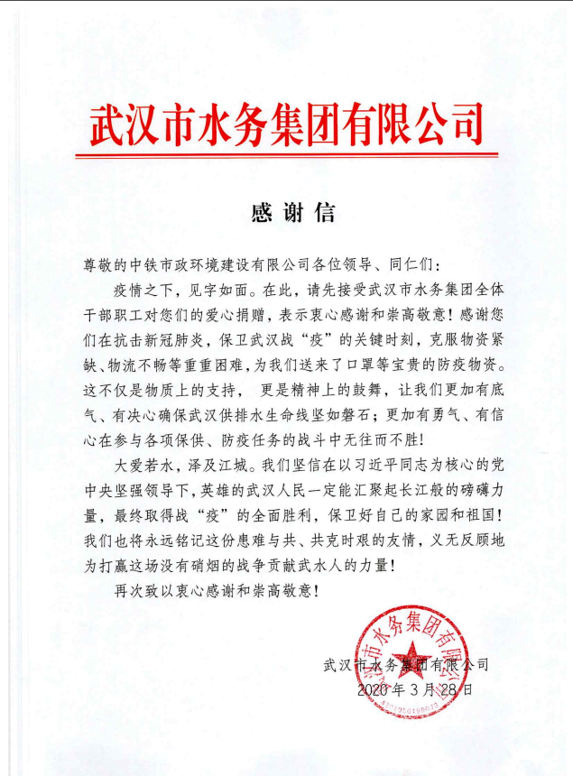 3月28日,公司承建的武漢黃家湖污水處理廠三期擴(kuò)建工程在抗擊新冠肺炎,保衛(wèi)武漢戰(zhàn)“疫”的關(guān)鍵時刻,克服物資緊缺、物流不暢等困難,向武漢市水務(wù)集團(tuán)有限公司贈送口罩等防疫物資,與他們患難與共、共克時艱,做好疫情防控工作。為此,武漢市水務(wù)集團(tuán)有限公司特致電表示感謝。...