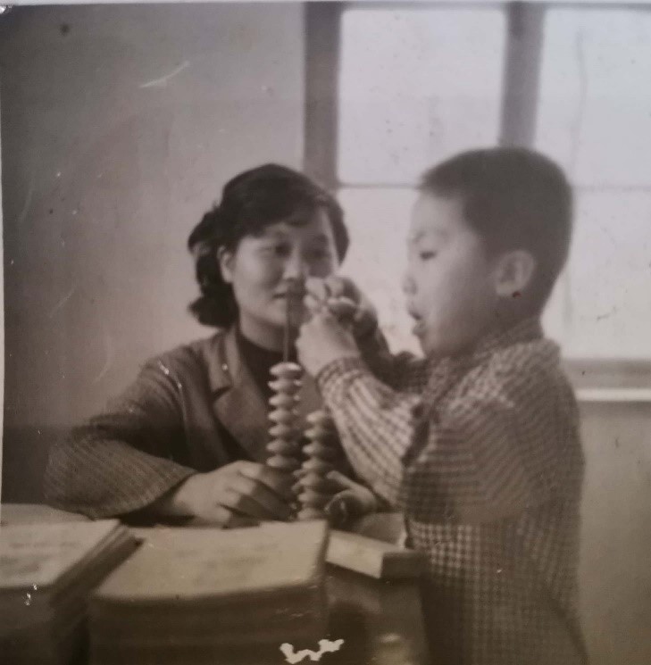 在這張泛黃的老舊照片上,老師孫毅眼神充滿關懷,手把手地教導著一年級的孔慶偉擺弄教具上的珠子。小朋友神情專注,微微張開的嘴巴似乎急切著想解開教具上謎題。