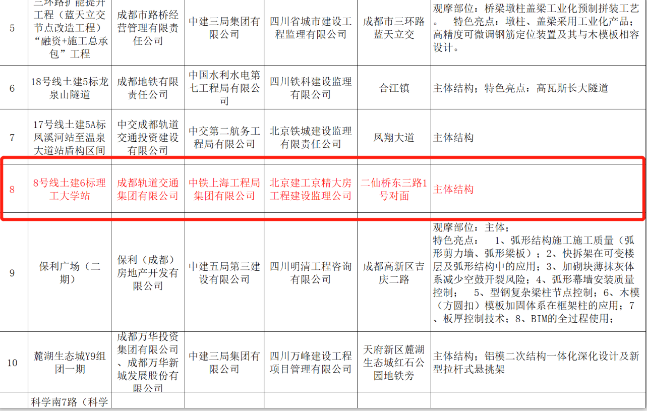 成都軌道交通8號線6標理工大學站榮獲成都市優質示范工程